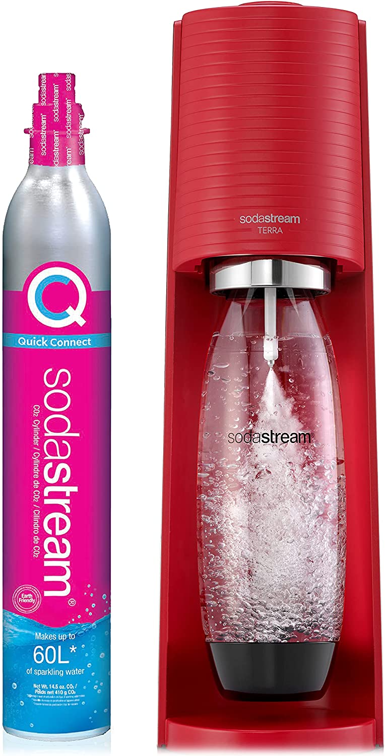 Includes: sparkling water maker, quick connect 60L Co2 cylinder, and 1 liter dishwasher-safe BPA-free reusable carbonating bottles.